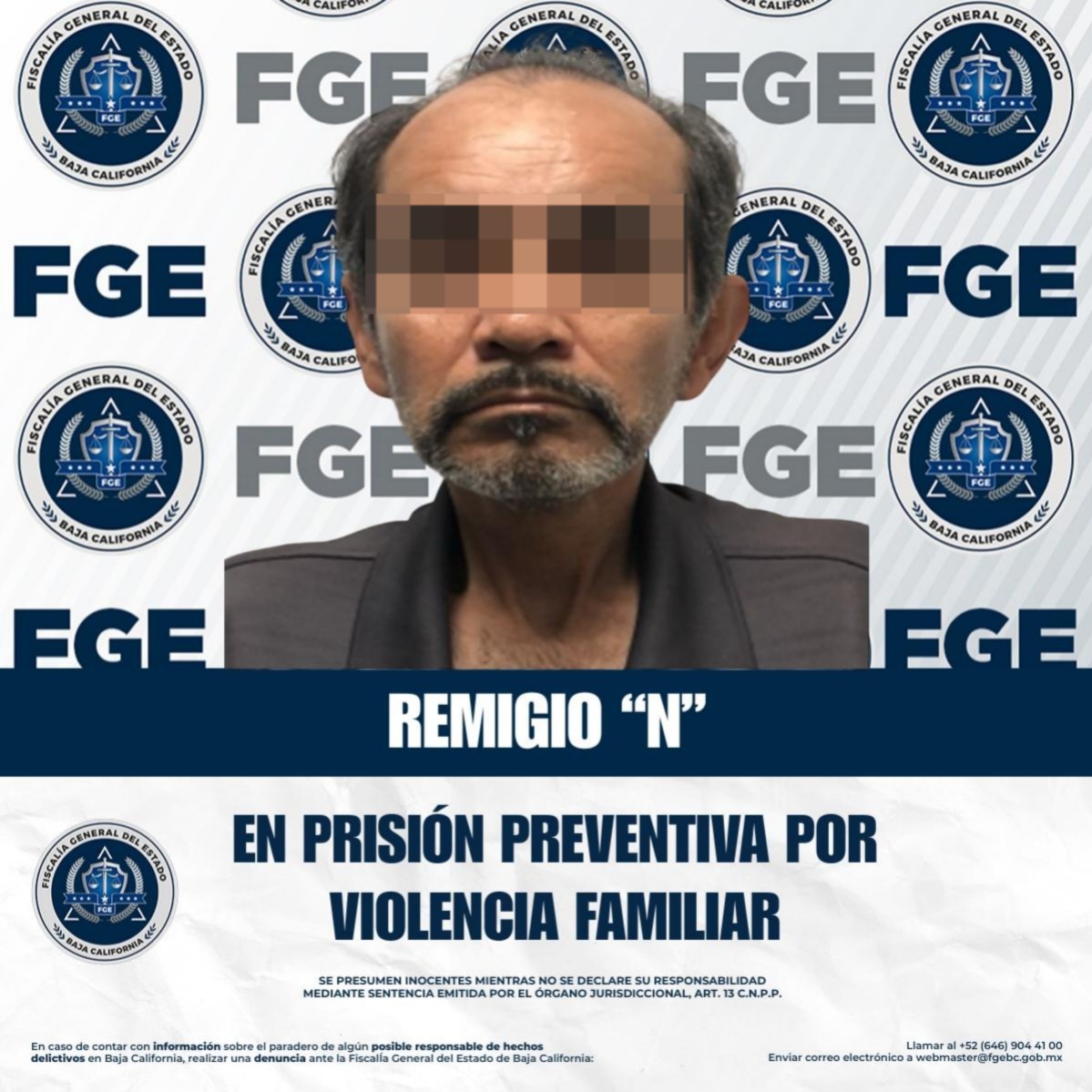 TIJUANA, BAJA CALIFORNIA. - La Fiscalía Regional de Tijuana informó que, a través de las labores realizadas por la Unidad de Investigación con Detenido, se logró obtener la vinculación a proceso con la medida cautelar de prisión preventiva justificada en contra de Remigio “N”, por su probable responsabilidad en el delito de violencia familiar.