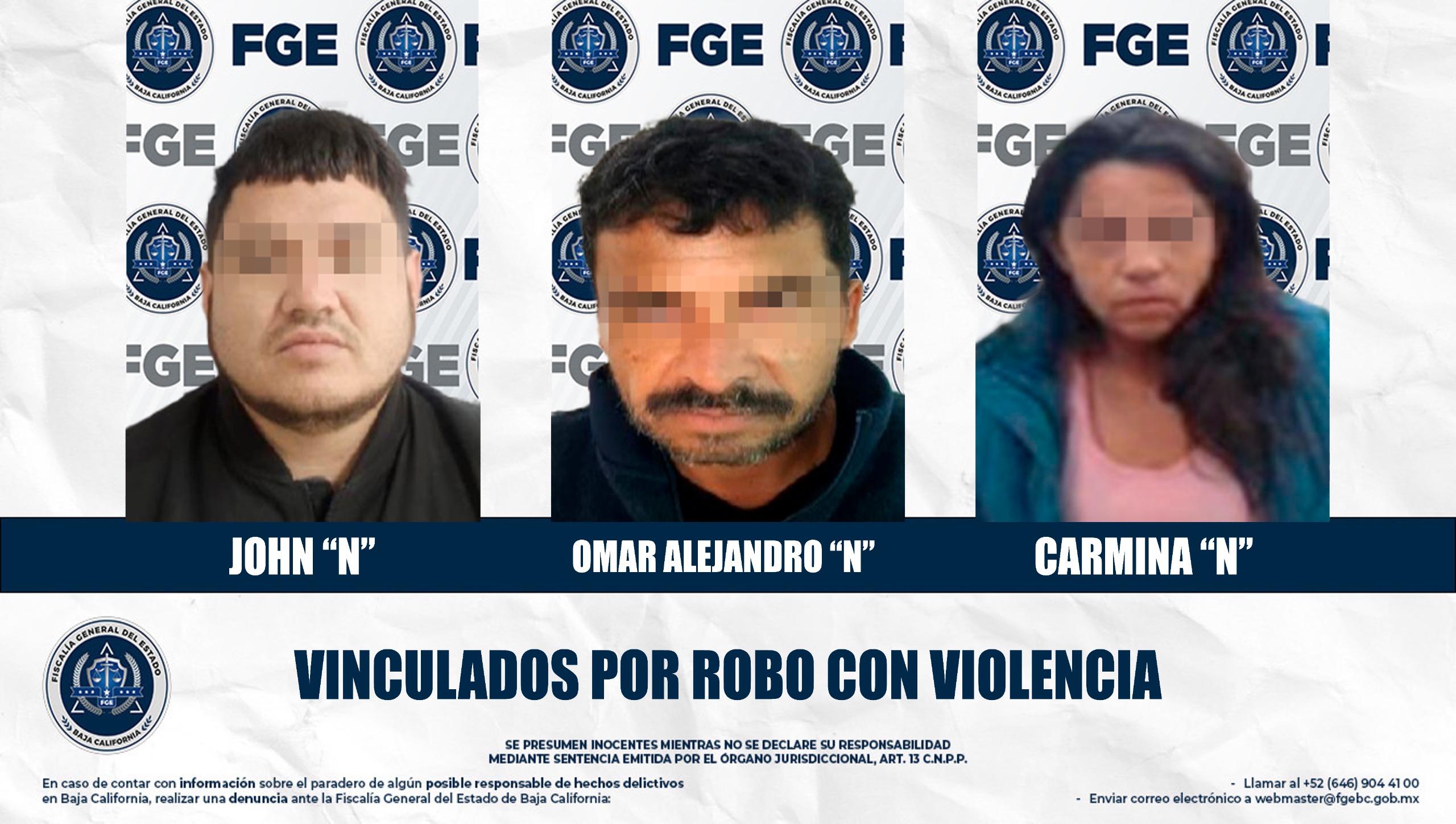 MEXICALI, BAJA CALIFORNIA. - La Fiscalía Regional de Mexicali obtuvo la vinculación a proceso de dos hombres y una mujer por su presunta participación en el delito de robo calificado cometido a establecimiento comercial abierto al público, en hechos distintos.