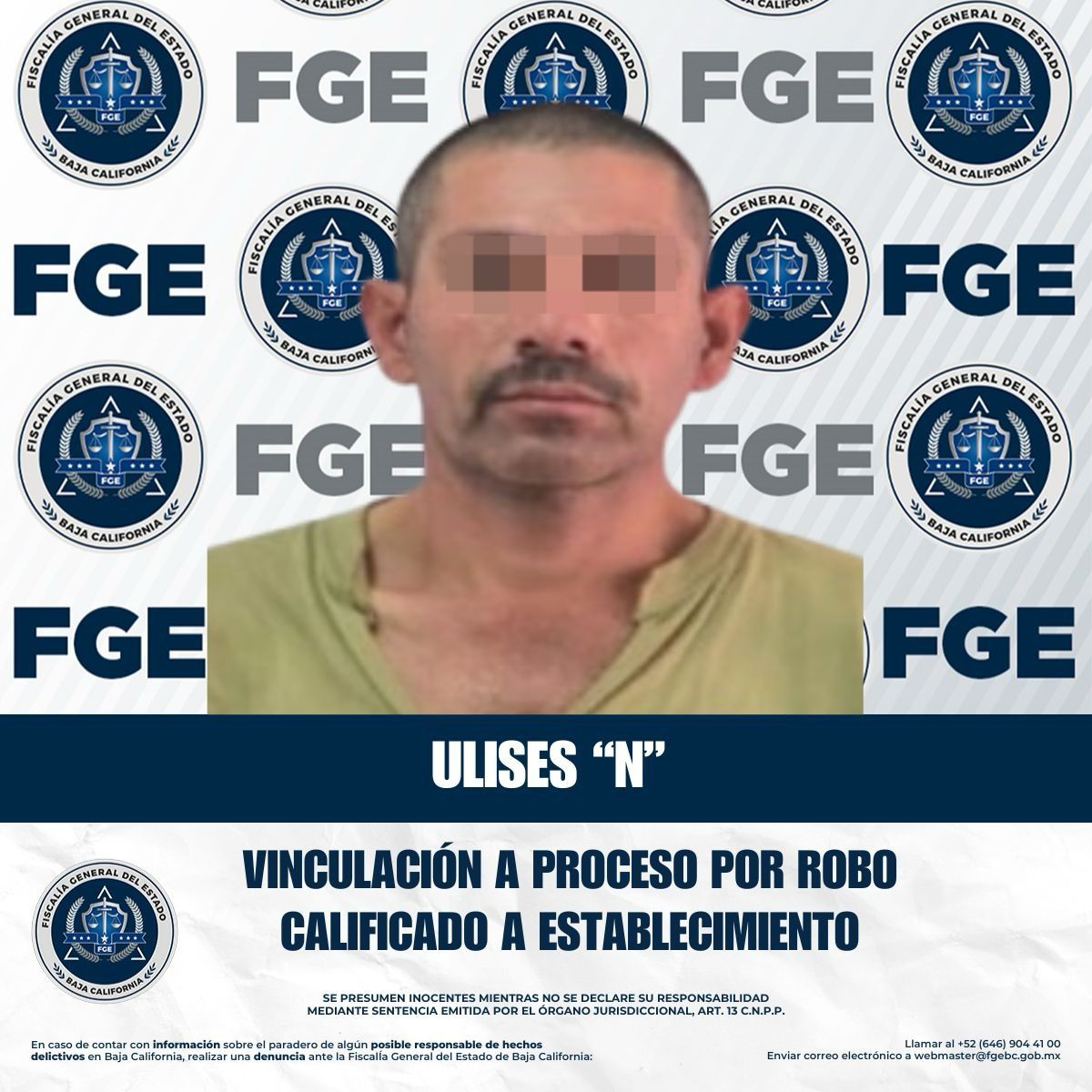 TECATE, BAJA CALIFORNIA. - La Unidad de Delitos Contra Robos, adscrita a la Fiscalía Regional de Tecate, obtuvo la vinculación a proceso en contra de Ulises “N”, por su presunta responsabilidad en el delito de robo calificado cometido a establecimiento abierto al público.