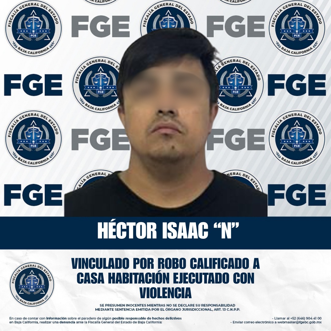 ENSENADA, BAJA CALIFORNIA. - La Fiscalía Regional de Ensenada obtuvo auto de vinculación a proceso en contra de Héctor Isaac “N”, por su probable responsabilidad en el delito de robo calificado a casa habitación ejecutado con violencia, derivado de hechos ocurridos en septiembre de 2024.