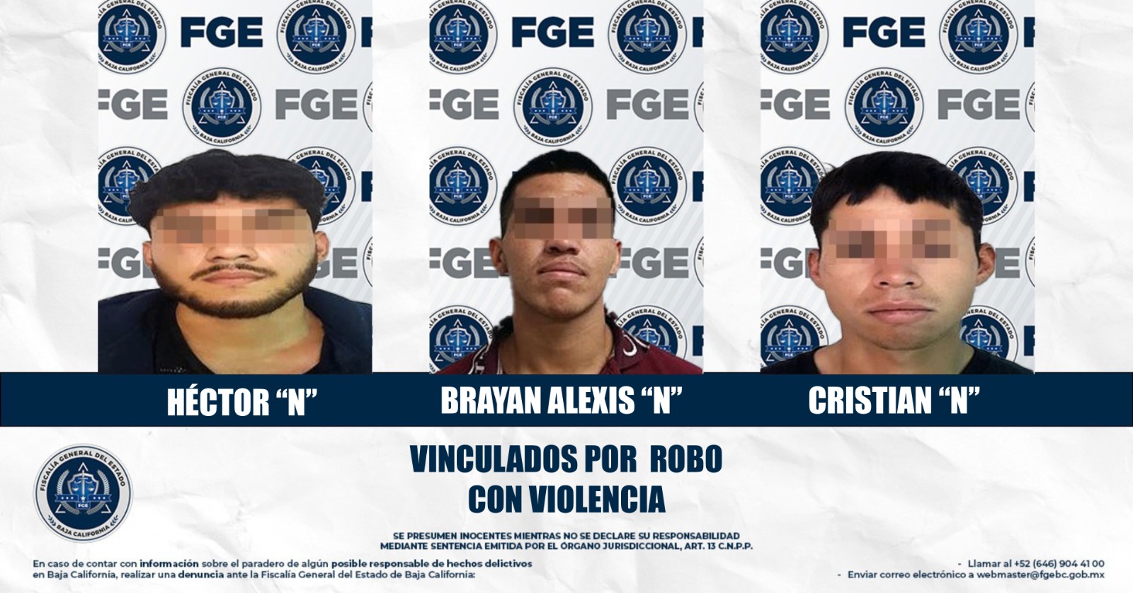 MEXICALI, BAJA CALIFORNIA. - La Fiscalía Regional de Mexicali, a través de las Unidades de Investigación con Detenidos Oriente y Robo Oriente, logró el inicio de un proceso penal en contra de tres hombres relacionados con robos violentos.