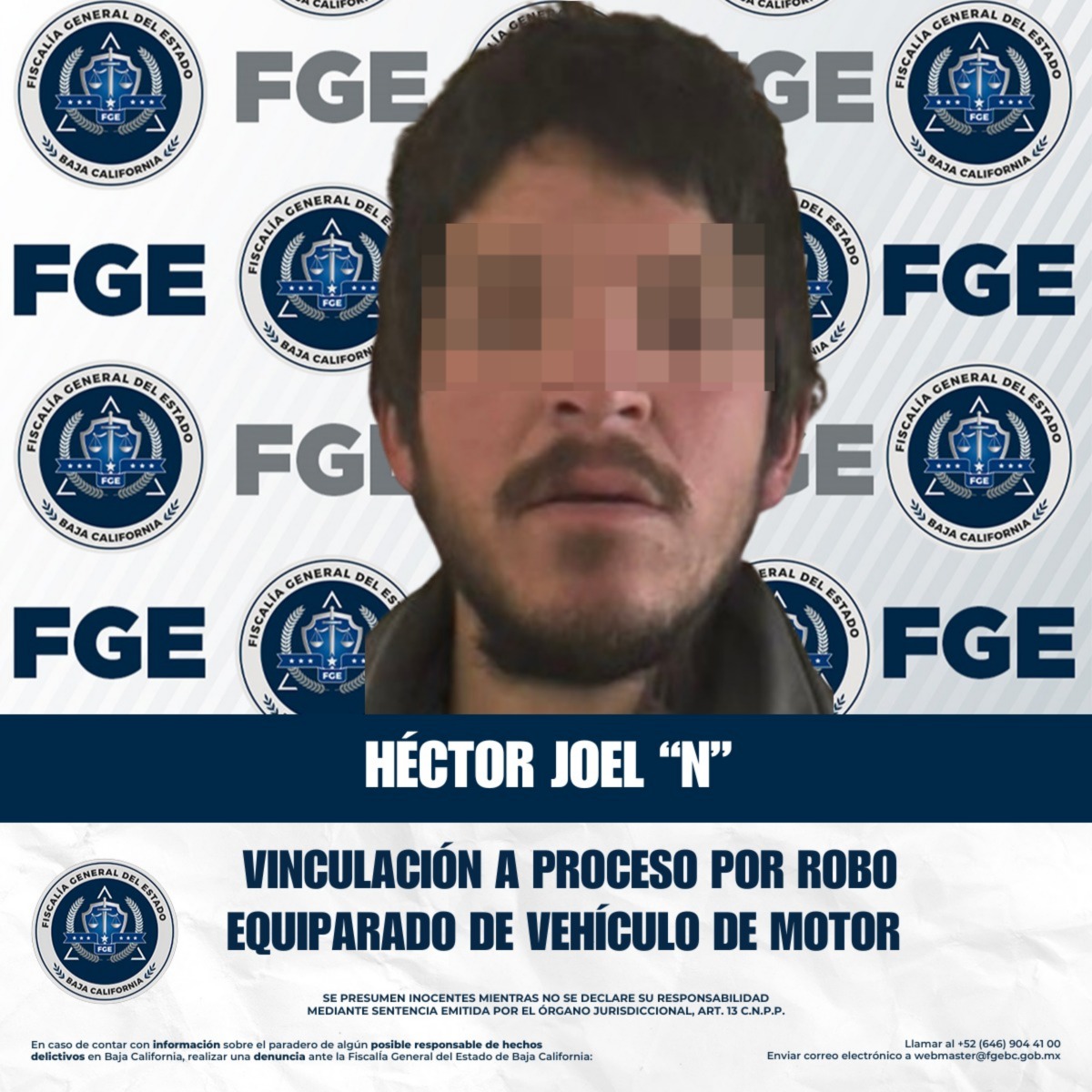 TIJUANA, BAJA CALIFORNIA. - La Fiscalía Regional de Tijuana, a través de la Unidad de Investigación Especializada en Robo de Vehículos, obtuvo la vinculación a proceso de Héctor Joel “N”, por su presunta responsabilidad en el delito de robo equiparado de vehículo de motor, en su modalidad de poseer.