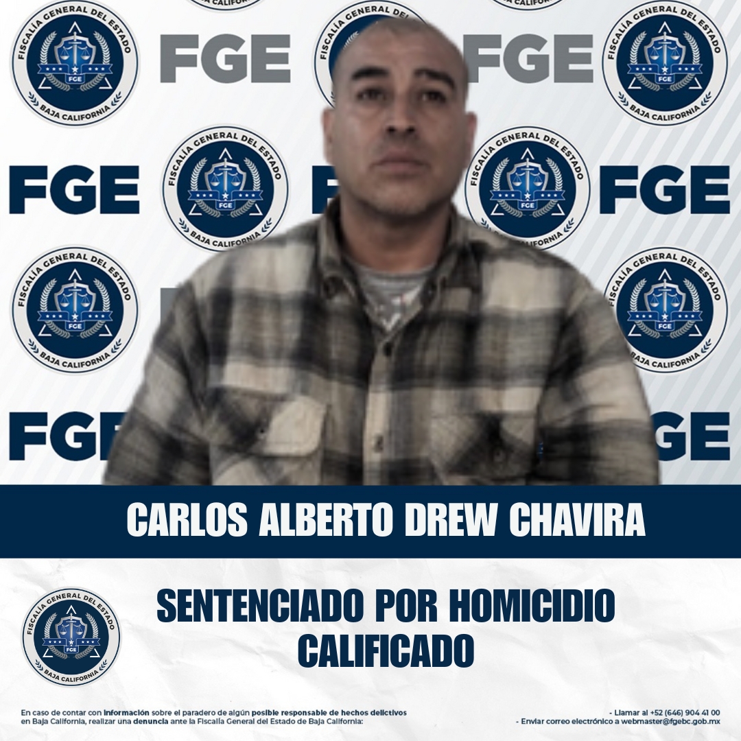 ENSENADA, BAJA CALIFORNIA. - La Fiscalía Especializada en Delitos Contra la Vida de la Fiscalía General del Estado obtuvo una sentencia de 20 años de prisión contra Carlos Alberto Drew Chavira, declarado culpable del delito de homicidio calificado.