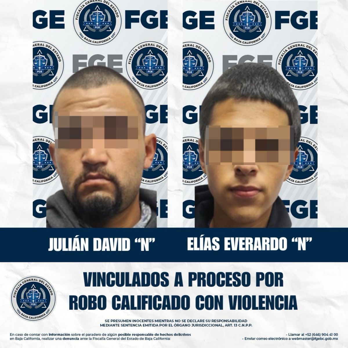 TIJUANA, BAJA CALIFORNIA. - La Fiscalía Regional de Tijuana, a través de la Unidad de Investigación con Detenido, obtuvo la vinculación a proceso y la imposición de prisión preventiva oficiosa en contra de Julián David “N” y Elías Everardo “N”, por su presunta responsabilidad en el delito de robo calificado cometido de noche y ejecutado con violencia.