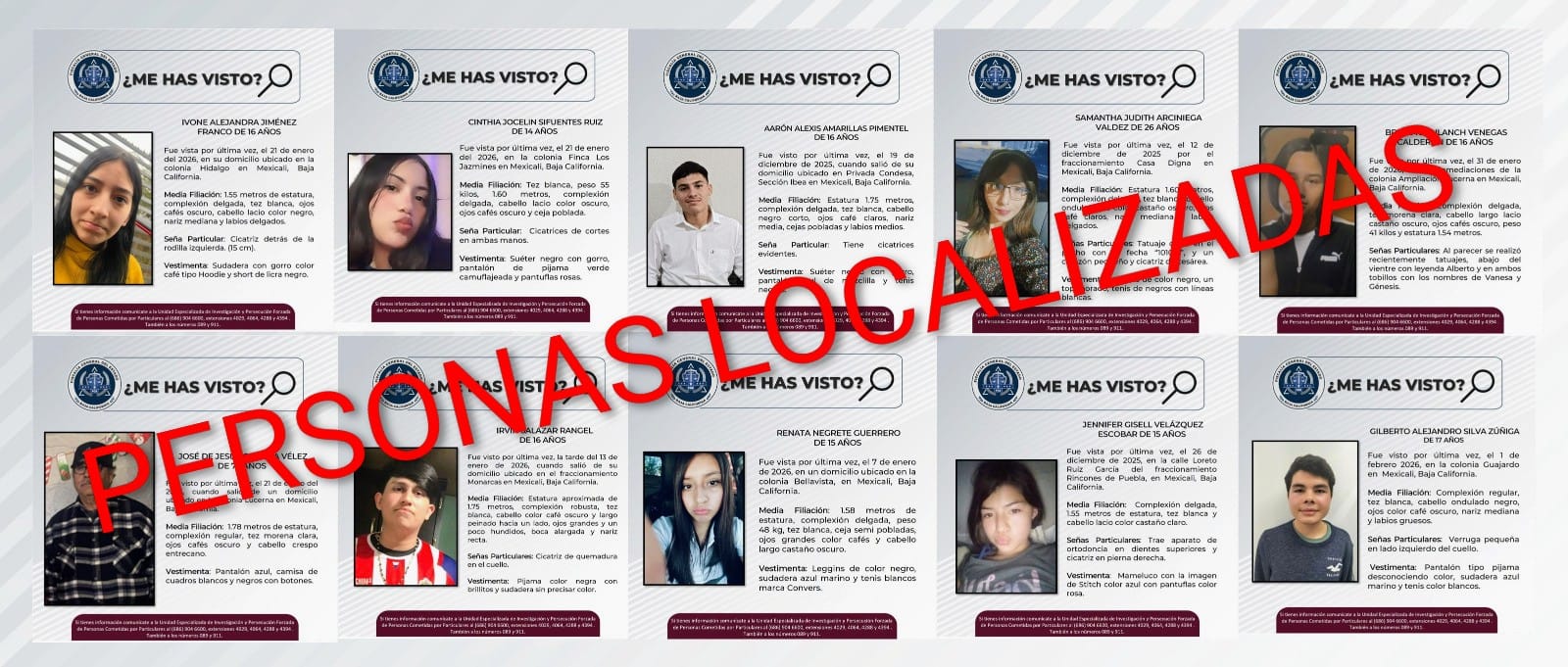 Por lo anterior, se cancelan las pesquisas generadas para la localización de Samantha Judith Arechiga Váldez de 26 años, José de Jesús Corona Vélez de 73, así como los menores Ivone Alejandra Jiménez Franco de 16, Cinthia Jocelin Sifuentes Ruiz de 14; Aarón Alexis Amarillas Pimentel de 16; Briana Zonlanch Venegas Calderón de 16; Irvin Salazar Ranfel de 16; Renata Negrete Guerrero de 15; Jennifer Gisell Velázquez Escobar de 15 y Giberto Alejandro Silva Zuñiga de 17 años.