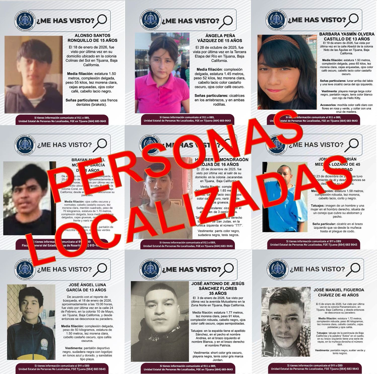 Las personas localizadas son: Alonso Santos Ronquillo, de 15 años; Ángela Peña Vázquez, de 15 años; Barbara Yasmín Olvera Castillo, de 13 años; Brayan Manuel Montes García, de 18 años; Humberto Mondragón Rojas, de 16 años; Jonathan Adrián Medina Lozano, de 45 años; José Ángel Luna García, de 13 años; José Antonio de Jesús Sánchez Flores, de 33 años y José Manuel Figueroa Chávez, de 40 años.
