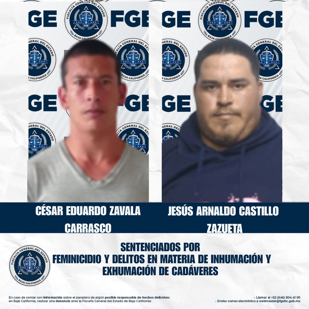 ENSENADA, BAJA CALIFORNIA. - La Fiscalía General del Estado, a través de la Fiscalía Especializada en Delitos Contra la Vida, obtuvo una sentencia condenatoria de 35 años de prisión en contra de César Eduardo Zavala Carrasco, alias “El Palomo”, y Jesús Arnaldo Castillo Zazueta, alias “El Bélico”, quienes fueron encontrados culpables de los delitos de feminicidio y de inhumación y exhumación de cadáveres.