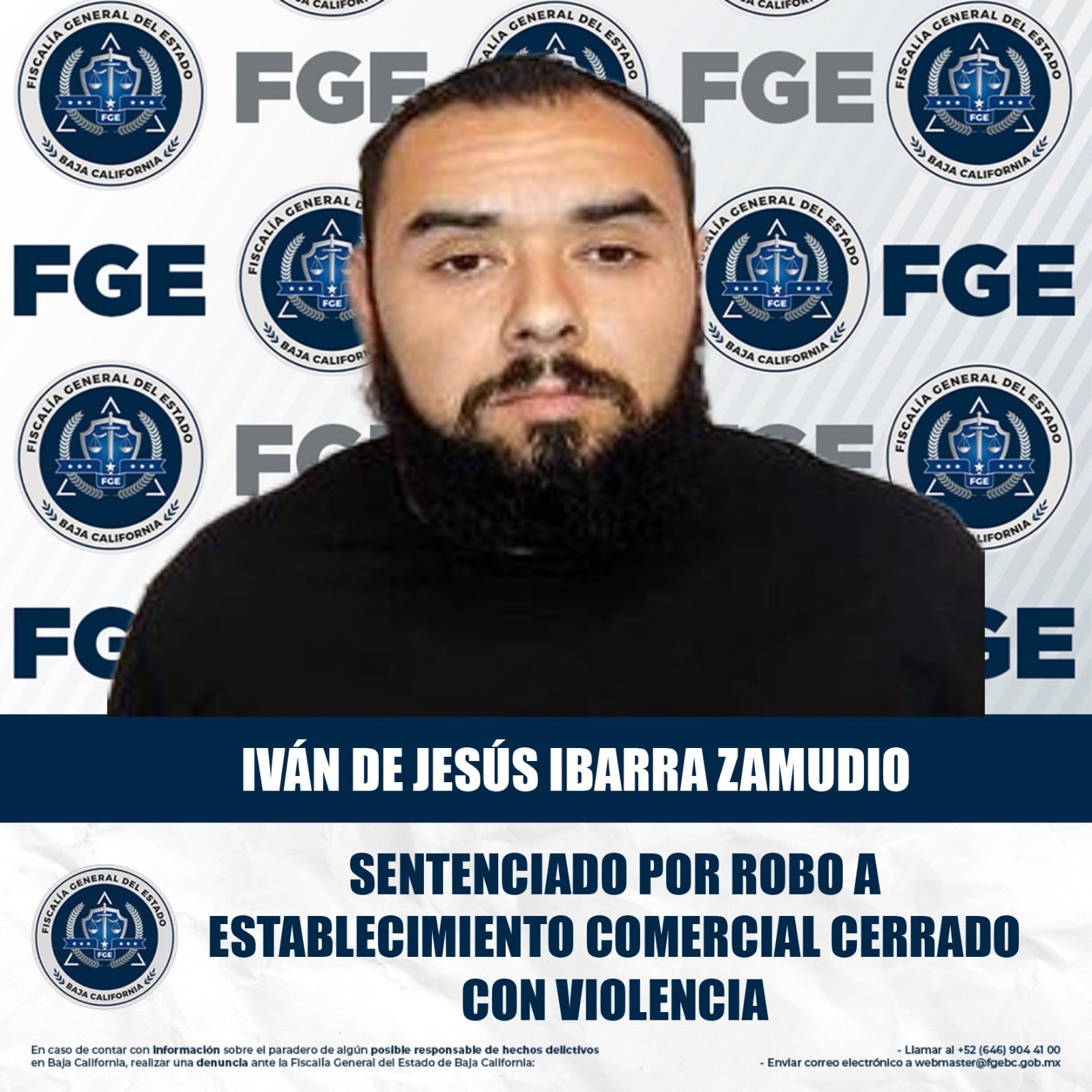 MEXICALI, BAJA CALIFORNIA. - La Fiscalía Regional de Mexicali, a través de la Unidad de Investigación de Delitos de Robo Oriente, logro sentencia condenatoria en contra de Iván de Jesús Ibarra Zamudio por el delito de robo a establecimiento comercial cerrado con violencia.