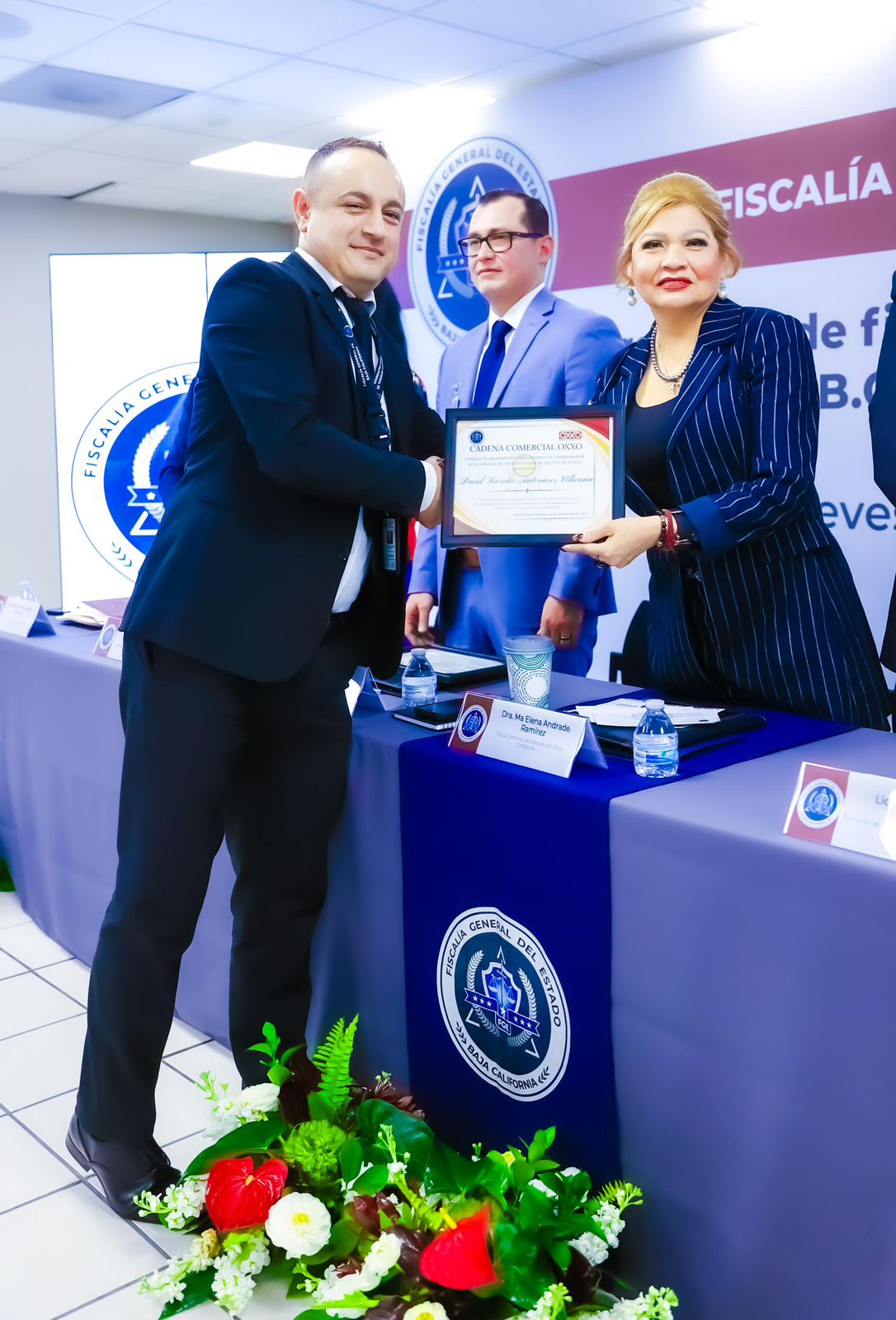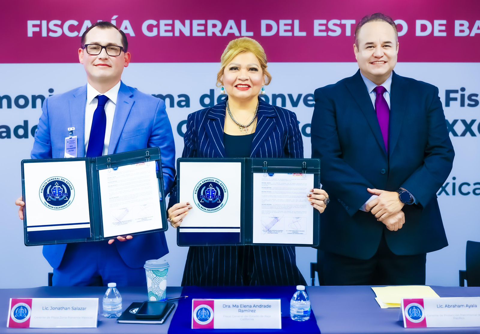 MEXICALI, BAJA CALIFORNIA. - La Fiscal General del Estado, Dra. Ma. Elena Andrade Ramírez, reiteró el compromiso institucional de trabajar de manera coordinada con el sector comercial para reducir la incidencia delictiva y fortalecer la seguridad ciudadana, durante la firma de un convenio de colaboración con la cadena comercial OXXO.