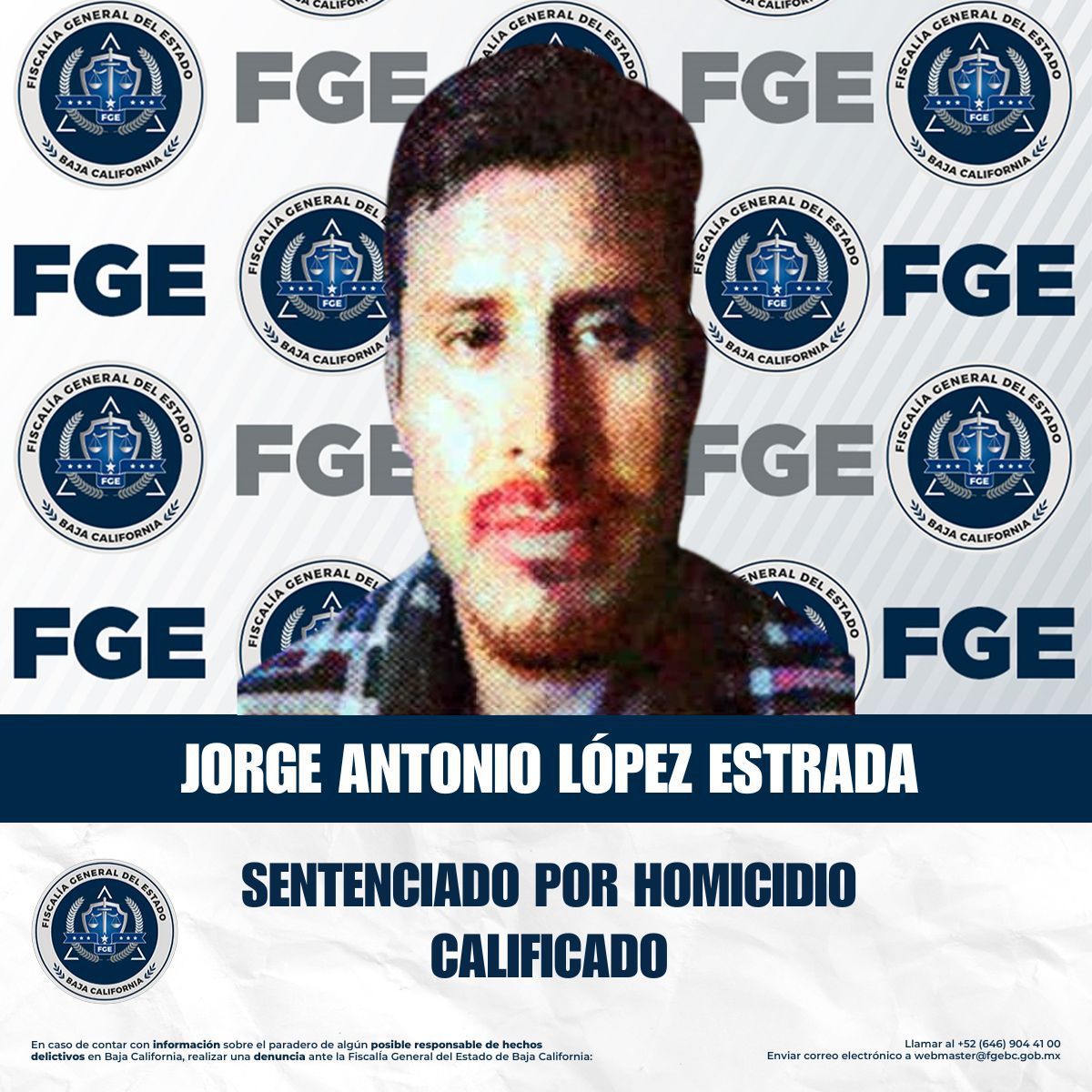 TIJUANA, BAJA CALIFORNIA. - La Coordinación de Averiguaciones Previas y Control de Proceso, adscrita a la Fiscalía Regional de Tijuana, obtuvo sentencia condenatoria de 30 años de prisión en contra de Jorge Antonio López Estrada, por el delito de homicidio calificado.