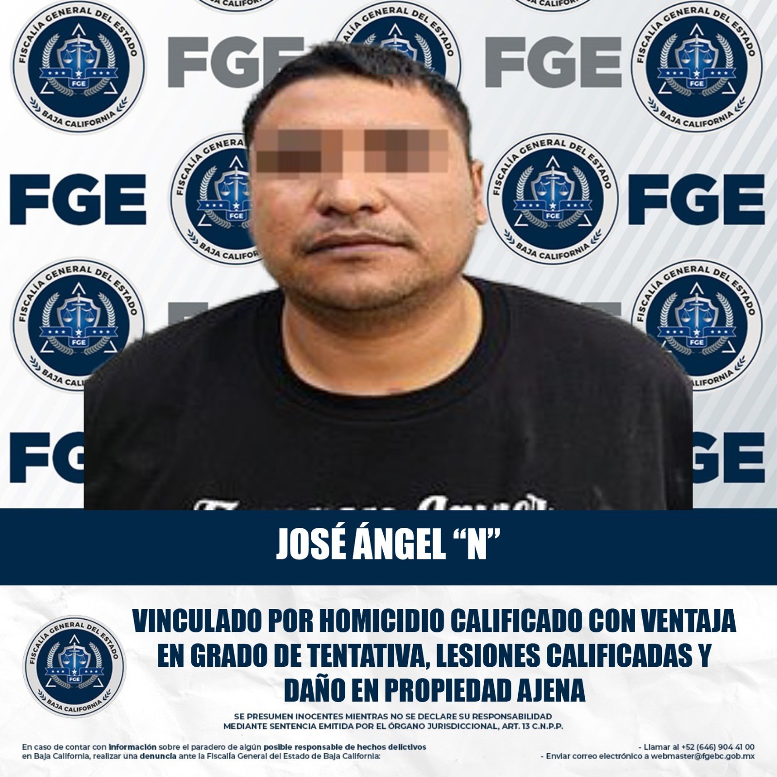 MEXICALI, BAJA CALIFORNIA. - La Fiscalía Regional de Mexicali, a través de la Unidad de Investigación de Delitos Contra las Personas y su Libertad, obtuvo la vinculación a proceso de José Ángel “N”, por su presunta participación en los delitos de homicidio calificado con ventaja en grado de tentativa, lesiones calificadas y daño en propiedad ajena.