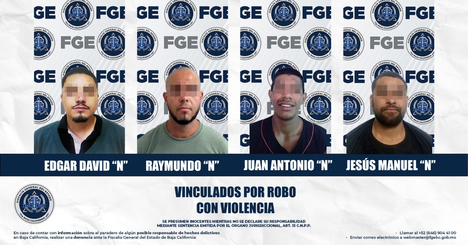 MEXICALI, BAJA CALIFORNIA. - Como resultado de la sólida integración de las carpetas de investigación, la Fiscalía Regional de Mexicali, a través de las Unidades de Investigación de Delitos de Robo Poniente y Oriente, obtuvo la vinculación a proceso de cuatro individuos presuntamente implicados en el delito de robo en distintas modalidades.
