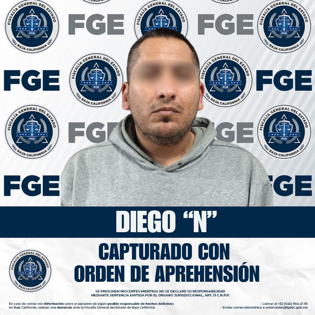 ENSENADA, BAJA CALIFORNIA - Agentes de la Fiscalía General del Estado de Baja California, adscritos al Grupo de Aprehensiones en Ensenada, cumplimentaron una orden de aprehensión en contra de Diego “N”, un hombre buscado por autoridades de Jalisco por los delitos de robo calificado y daño en las cosas a título doloso.