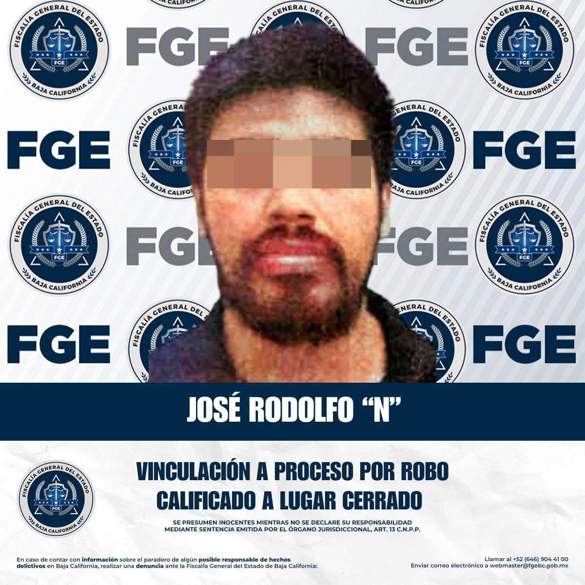 TIJUANA, BAJA CALIFORNIA. - La Fiscalía Regional de Tijuana obtuvo la vinculación a proceso y la imposición de la medida cautelar de prisión preventiva en contra de José Rodolfo “N”, por su presunta responsabilidad en el delito de robo calificado a lugar cerrado.