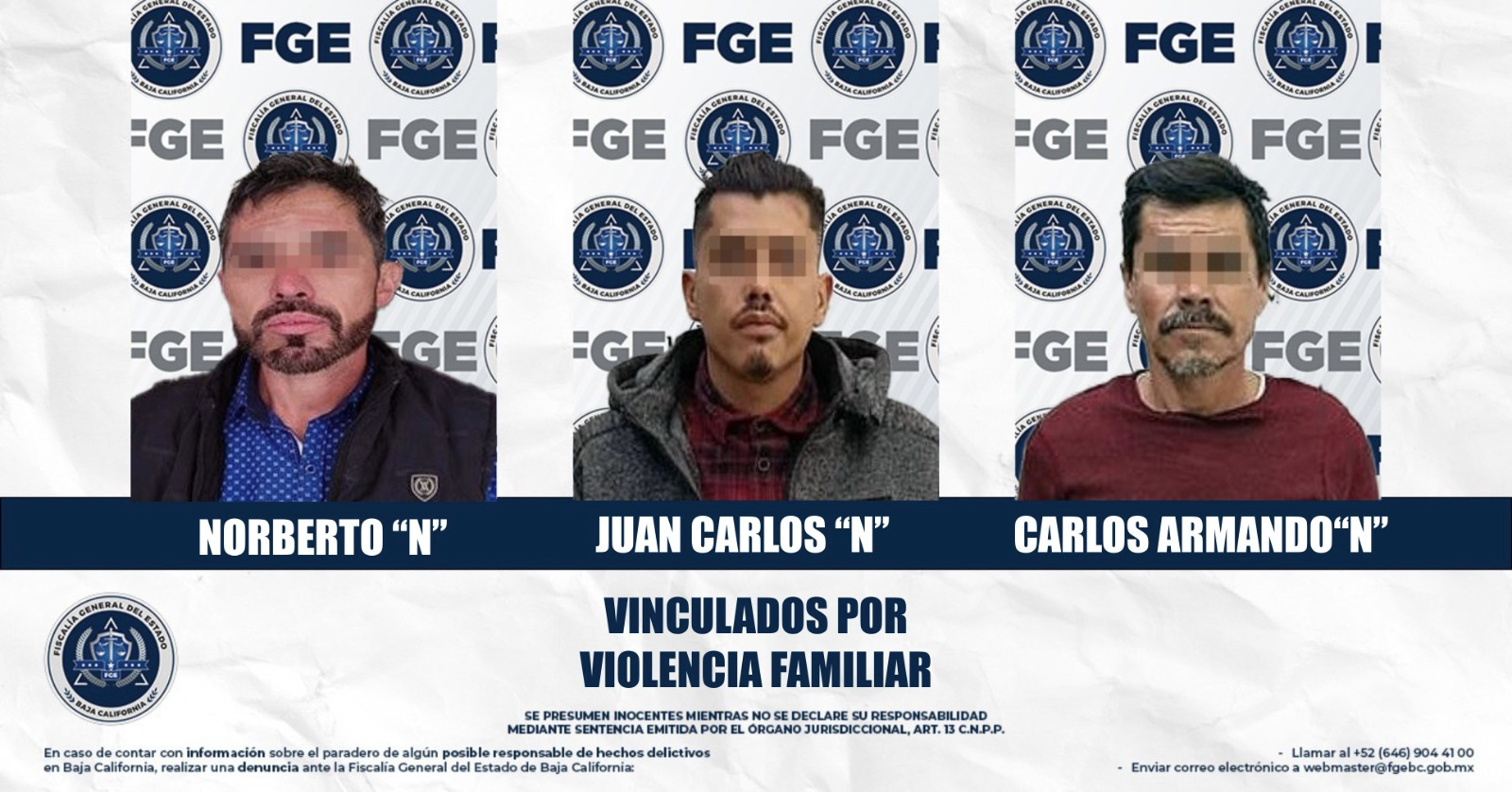 MEXICALI, BAJA CALIFORNIA. - La Fiscalía Regional de Mexicali logró que tres hombres fueran vinculados a proceso tras presentar pruebas de agresiones contra sus familiares. En todos los casos, el Juez de Control determinó prisión preventiva como medida cautelar.