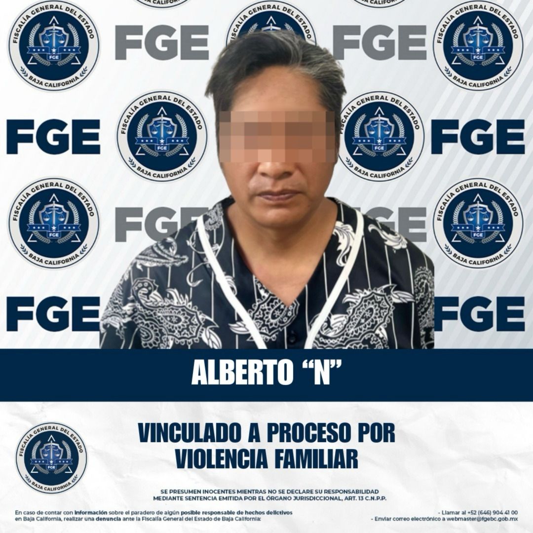 ENSENADA, BAJA CALIFORNIA. - La Fiscalía Regional de Ensenada informó que, como resultado de los datos de prueba presentados por el Ministerio Público, se obtuvo la vinculación a proceso de Alberto “N” por el delito de violencia familiar, imponiéndose además la medida cautelar de prisión preventiva, determinada por el Juez de Control.