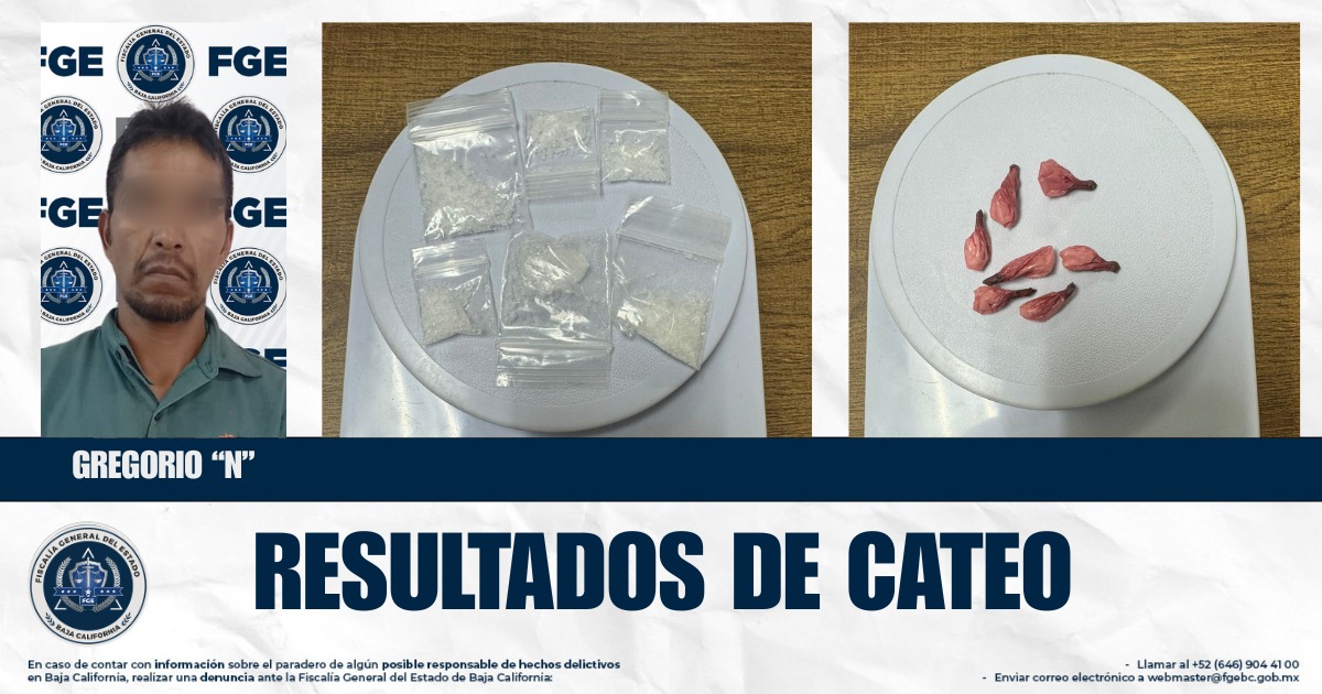 Como resultado de esta diligencia, fue detenido Gregorio “N”, y se aseguró droga consistente en seis envoltorios transparentes y siete envoltorios de color rosa, todos con una sustancia granulada al tacto con características similares a la metanfetamina, presuntamente destinada a su comercialización.