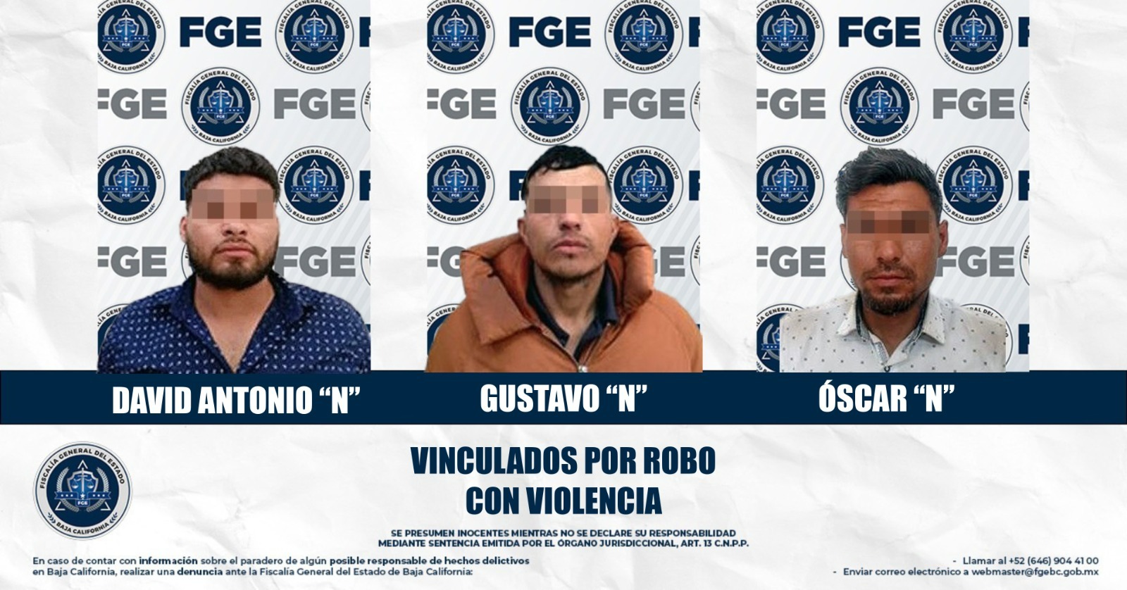 MEXICALI, BAJA CALIFORNIA. - La Fiscalía Regional de Mexicali obtuvo la vinculación a proceso de tres sujetos por su presunta responsabilidad en delitos de robo con violencia, en hechos distintos ocurridos en la capital del estado.
