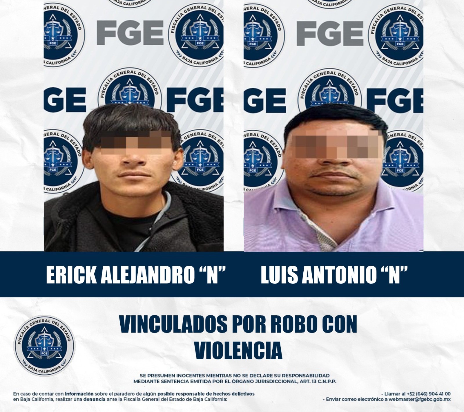 MEXICALI, BAJA CALIFORNIA. - Dos hombres implicados en robos violentos fueron vinculados a proceso a través de los elementos probatorios presentados por la Fiscalía Regional de Mexicali, a través de la Unidad de Investigación de Robo Oriente.