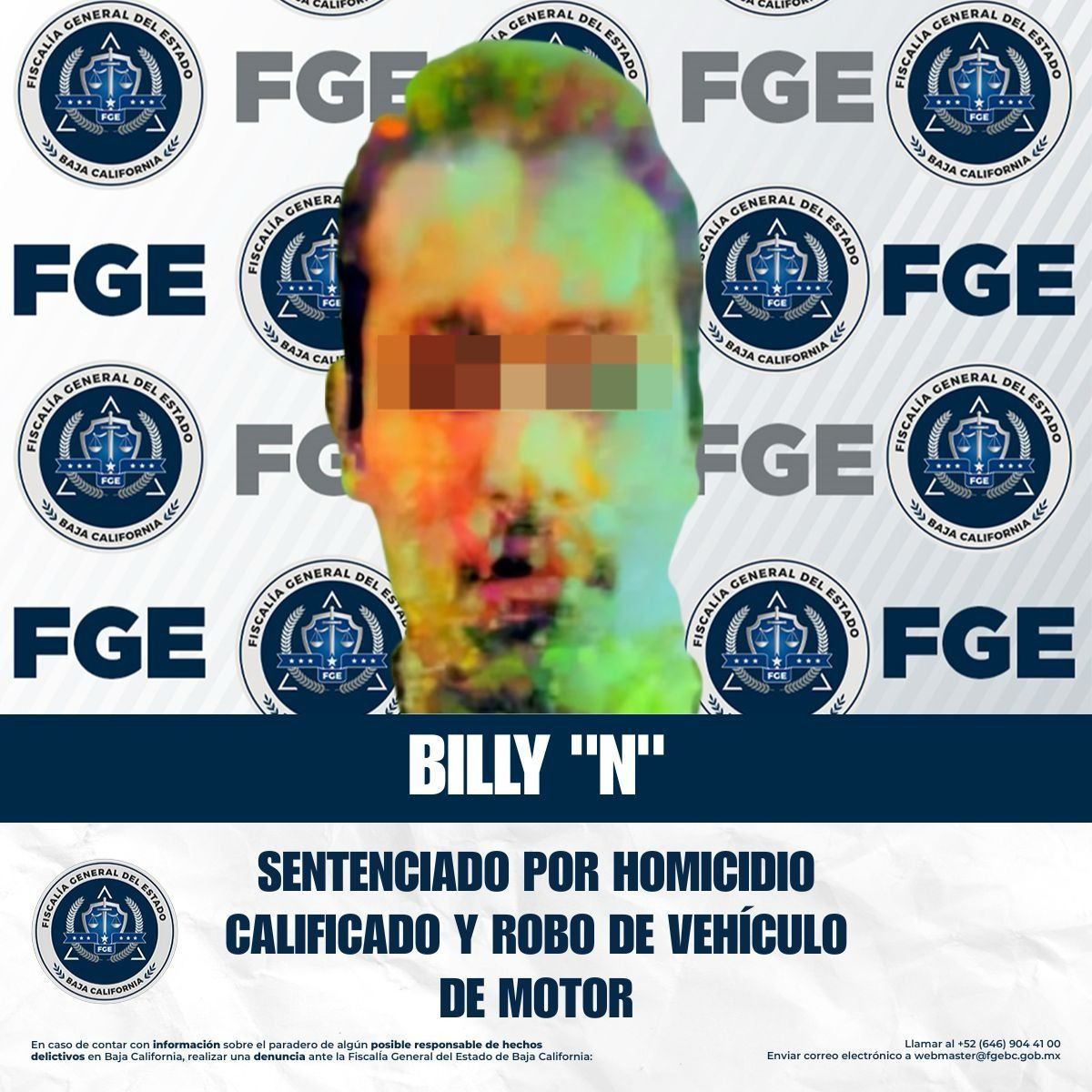 TIJUANA, BAJA CALIFORNIA. - La Fiscalía Regional de Tijuana, a través de la Coordinación de Averiguaciones Previas y Control de Proceso, obtuvo sentencia condenatoria de 25 años y 3 meses de prisión en contra de Billy “N”, por los delitos de homicidio calificado y robo de vehículo de motor.