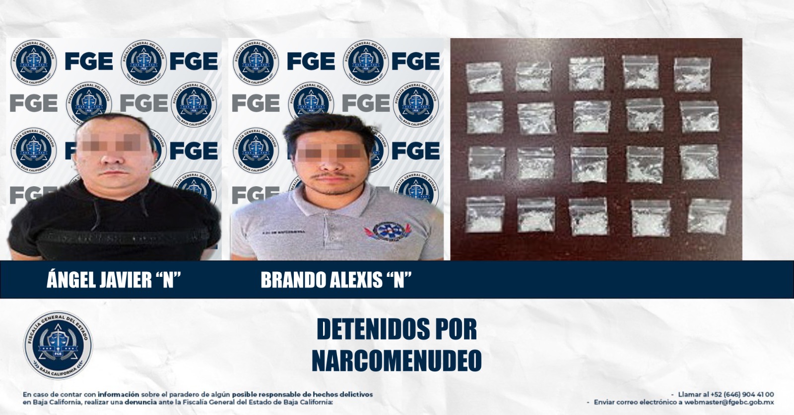 MEXICALI, BAJA CALIFORNIA. - Como resultado de la estrategia de combate a la venta de drogas y en atención a denuncias ciudadanas, la Fiscalía General del Estado (FGE) cumplimentó una orden de cateo en la colonia Flores Magón, logrando la detención de dos personas y el aseguramiento de sustancias ilícitas.
