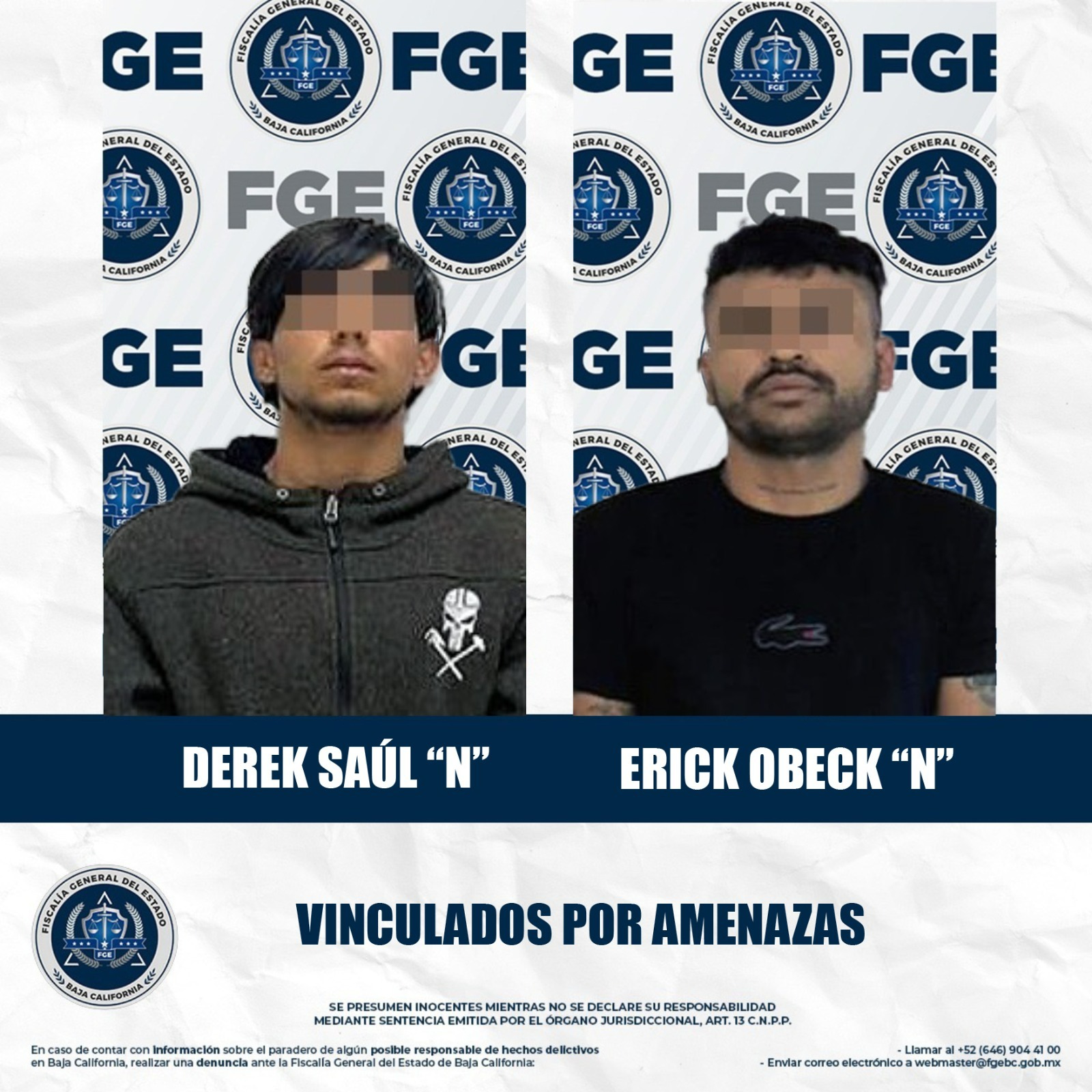 MEXICALI, BAJA CALIFORNIA. - La Fiscalía Regional de Mexicali, logró el inicio de procesos penales contra dos hombres señalados por el delito de amenazas, obteniendo en ambos casos la medida cautelar de prisión preventiva justificada.