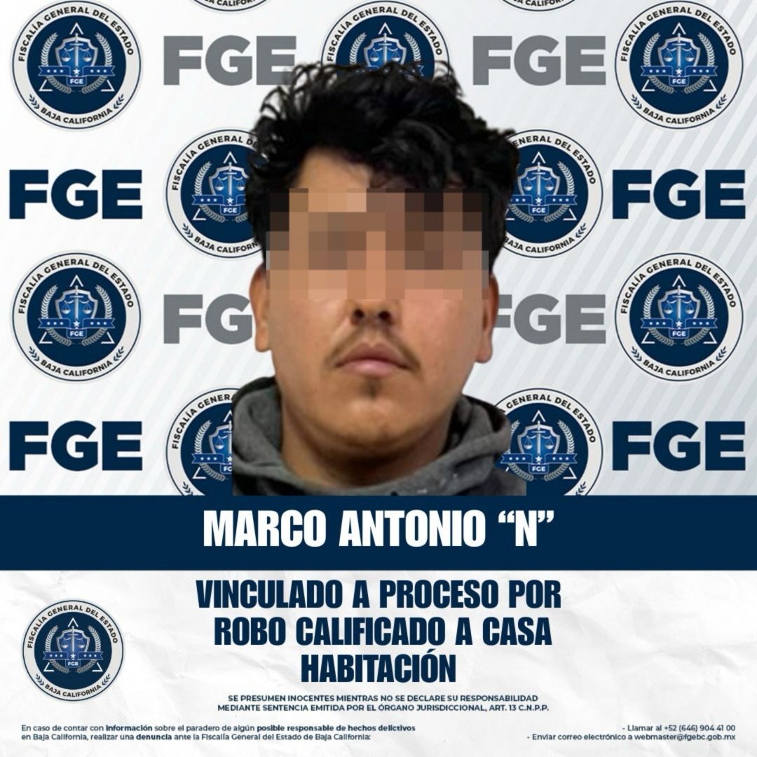 ENSENADA, BAJA CALIFORNIA. - La Fiscalía Regional de Ensenada, a través de la Unidad de Investigación de Robos, obtuvo la vinculación a proceso de Marco Antonio “N” por el delito de robo calificado a casa habitación, luego de que el Ministerio Público presentara ante el Juez de Control los datos de prueba que lo relacionan con el hecho. Como medida cautelar, se le impuso prisión preventiva.