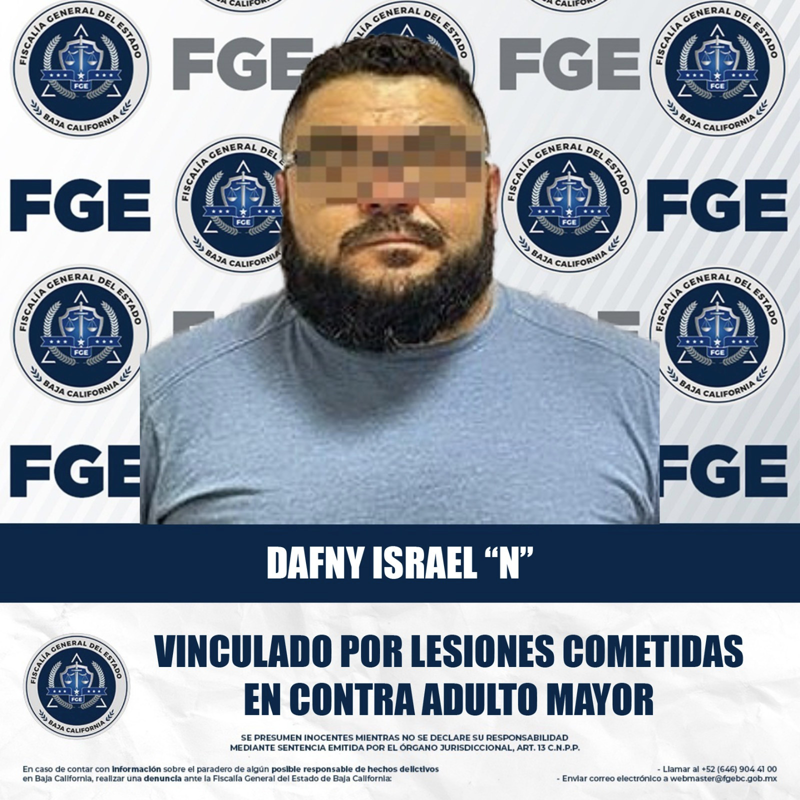 MEXICALI, BAJA CALIFORNIA. - La Fiscalía General del Estado (FGE), a través de la Unidad de Investigación de Delitos Contra las Personas y Su Libertad de la Fiscalía Regional de Mexicali, logró la vinculación a proceso de un individuo por su presunta responsabilidad en el delito de lesiones cometidas en contra de un adulto mayor.