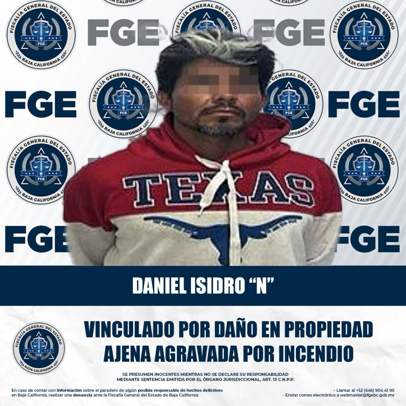 MEXICALI, BAJA CALIFORNIA. - La Fiscalía Regional de Mexicali, a través de la Unidad de Investigación de Delitos Contra el Patrimonio, Sociedad, Estado y Justicia, logró la vinculación a proceso de un sujeto acusado de daño en propiedad ajena agravado por incendio.