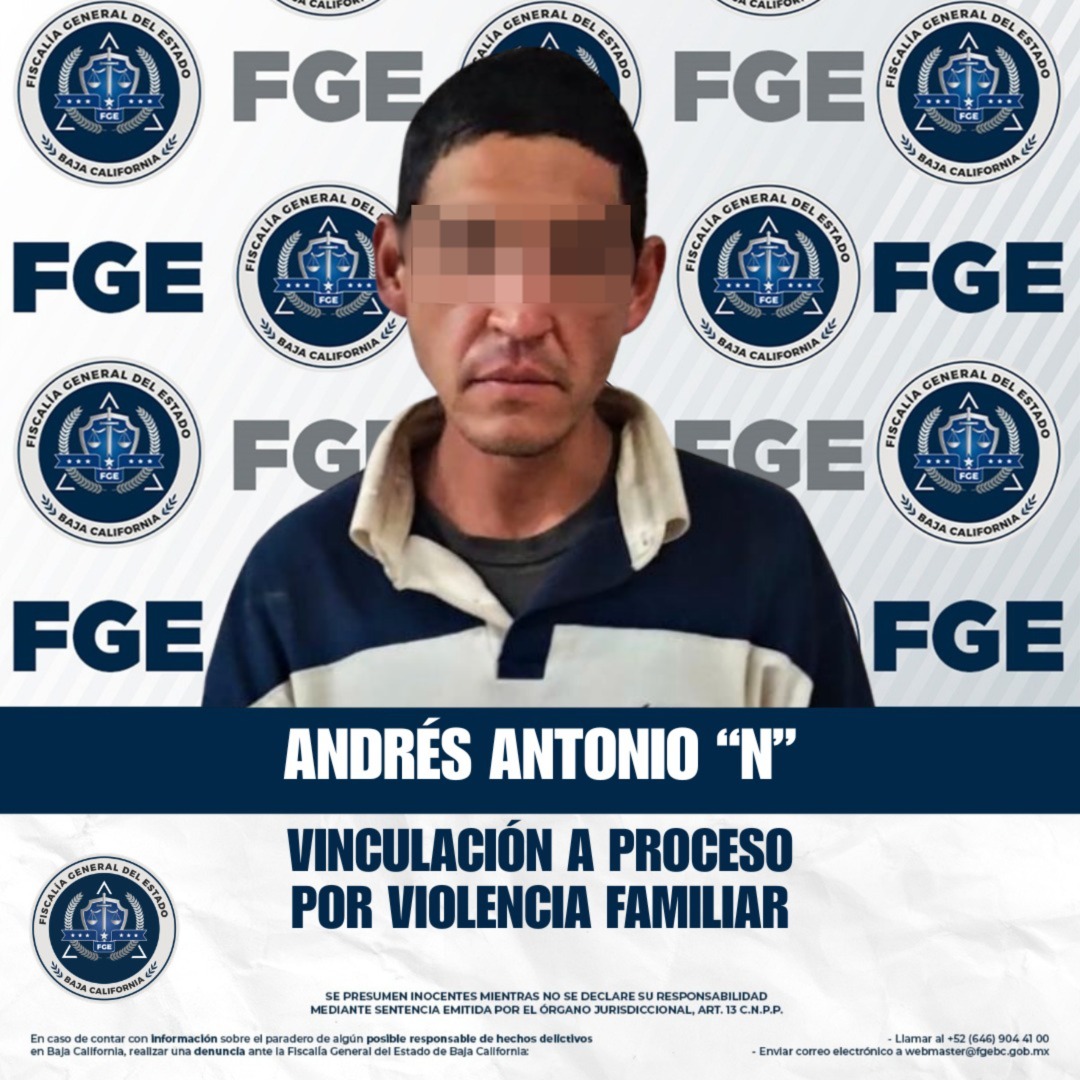 ENSENADA, BAJA CALIFORNIA. - La Fiscalía Regional de Ensenada obtuvo la vinculación a proceso en contra de Andrés Antonio “N” por su probable responsabilidad en el delito de violencia familiar, tras hechos ocurridos en la colonia Escritores. El imputado enfrenta prisión preventiva justificada debido al riesgo que representa para la víctima.