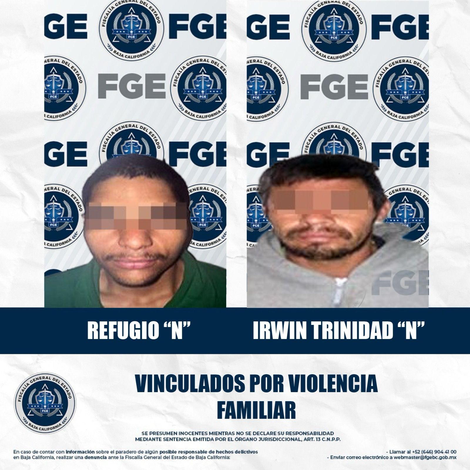 MEXICALI, BAJA CALIFORNIA. - La Fiscalía Regional de Mexicali, logró con base al trabajo realizado por la Unidad de Investigación con Detenidos Oriente, la vinculación a proceso de dos hombres acusados de agredir a sus familiares.
