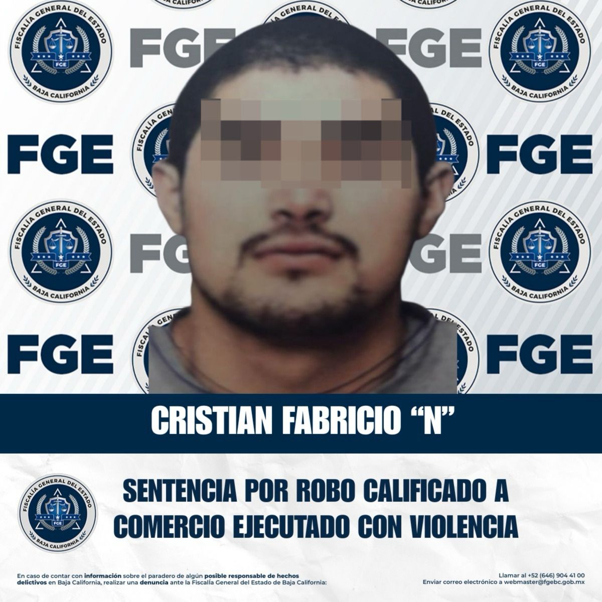 TIJUANA, BAJA CALIFORNIA. - La Fiscalía Regional de Tijuana informa que se logró una sentencia condenatoria para un individuo responsable del delito de robo calificado a comercio ejecutado con violencia.