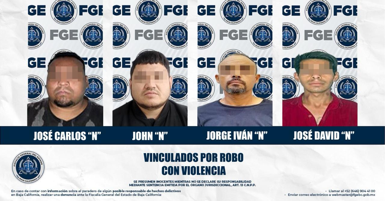 MEXICALI, BAJA CALIFORNIA. - La Fiscalía Regional de Mexicali, a través del trabajo de la Unidad de Investigación de Delitos con Detenidos Oriente y la Unidad de Robos Oriente, logró el inicio de procesos penales contra cuatro hombres señalados por su presunta participación en robos con violencia a establecimientos comerciales (OXXOS).