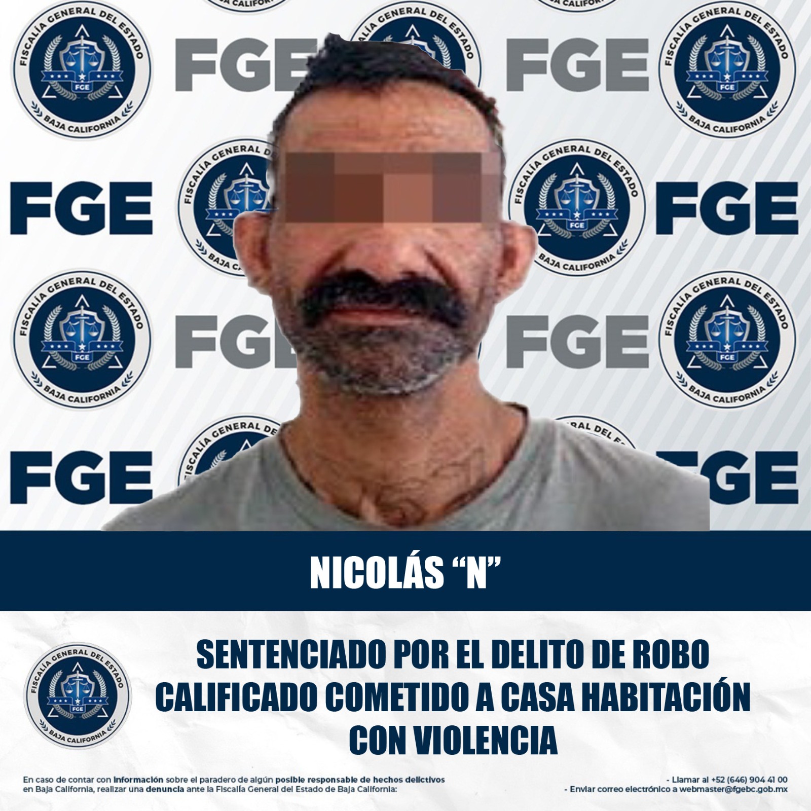 MEXICALI, BAJA CALIFORNIA. - La Fiscalía Regional de Mexicali obtuvo una sentencia condenatoria de cinco años y seis meses de prisión contra Nicolás “N”, al demostrarse su responsabilidad en el delito de robo calificado a casa habitación ejecutado con violencia.