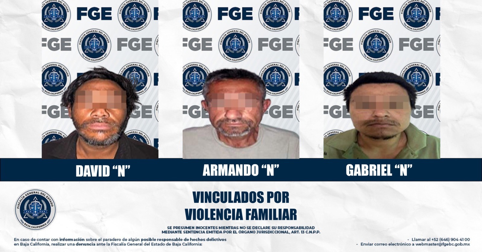 MEXICALI, BAJA CALIFORNIA. - La Fiscalía Regional de Mexicali, a través de la Unidad de Investigación de Delitos con Detenidos Oriente, obtuvo la vinculación a proceso de tres hombres imputados por el delito de violencia familiar.