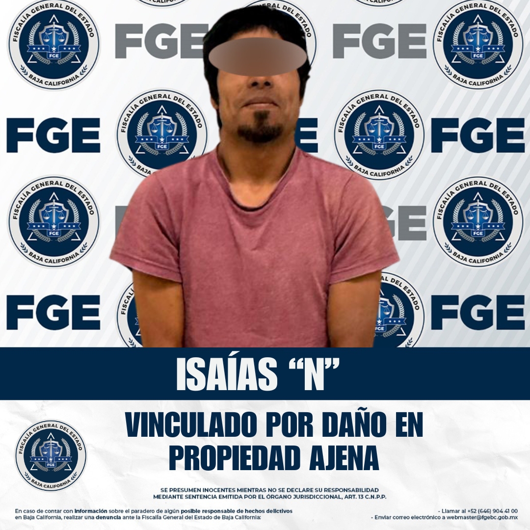 SAN QUINTÍN, BAJA CALIFORNIA. - La Fiscalía General del Estado, a través de la Fiscalía Regional de San Quintín, fortaleció las investigaciones que permitieron el cumplimiento de una orden de aprehensión y la vinculación a proceso en contra de Isaías “N”, por el delito de daño en propiedad ajena.