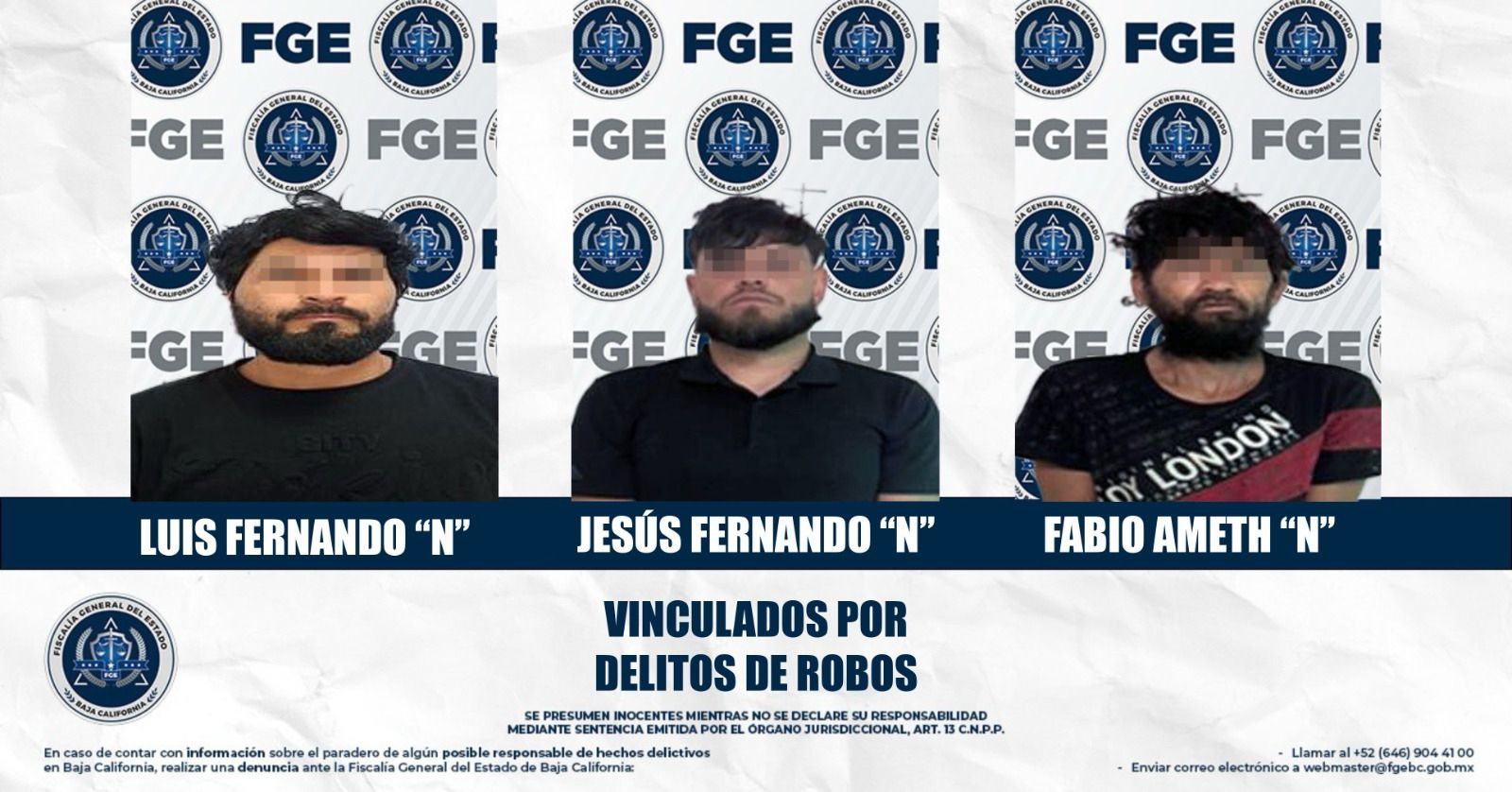 MEXICALI, BAJA CALIFORNIA - La Fiscalía General del Estado (FGE), a través de la Unidad de Investigación con Detenidos Oriente de la Fiscalía Regional de Mexicali, obtuvo la vinculación a proceso de tres sujetos presuntamente implicados en delitos de robo.