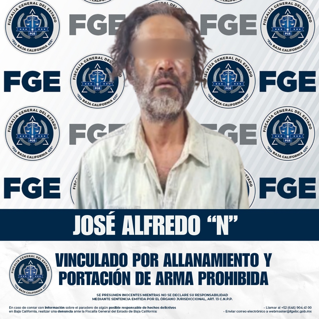ENSENADA, BAJA CALIFORNIA. - La Fiscalía Regional de Ensenada, a través de la Unidad de Investigación con Detenido, logró la vinculación a proceso de José Alfredo “N” por los delitos de allanamiento de morada y portación de arma prohibida.