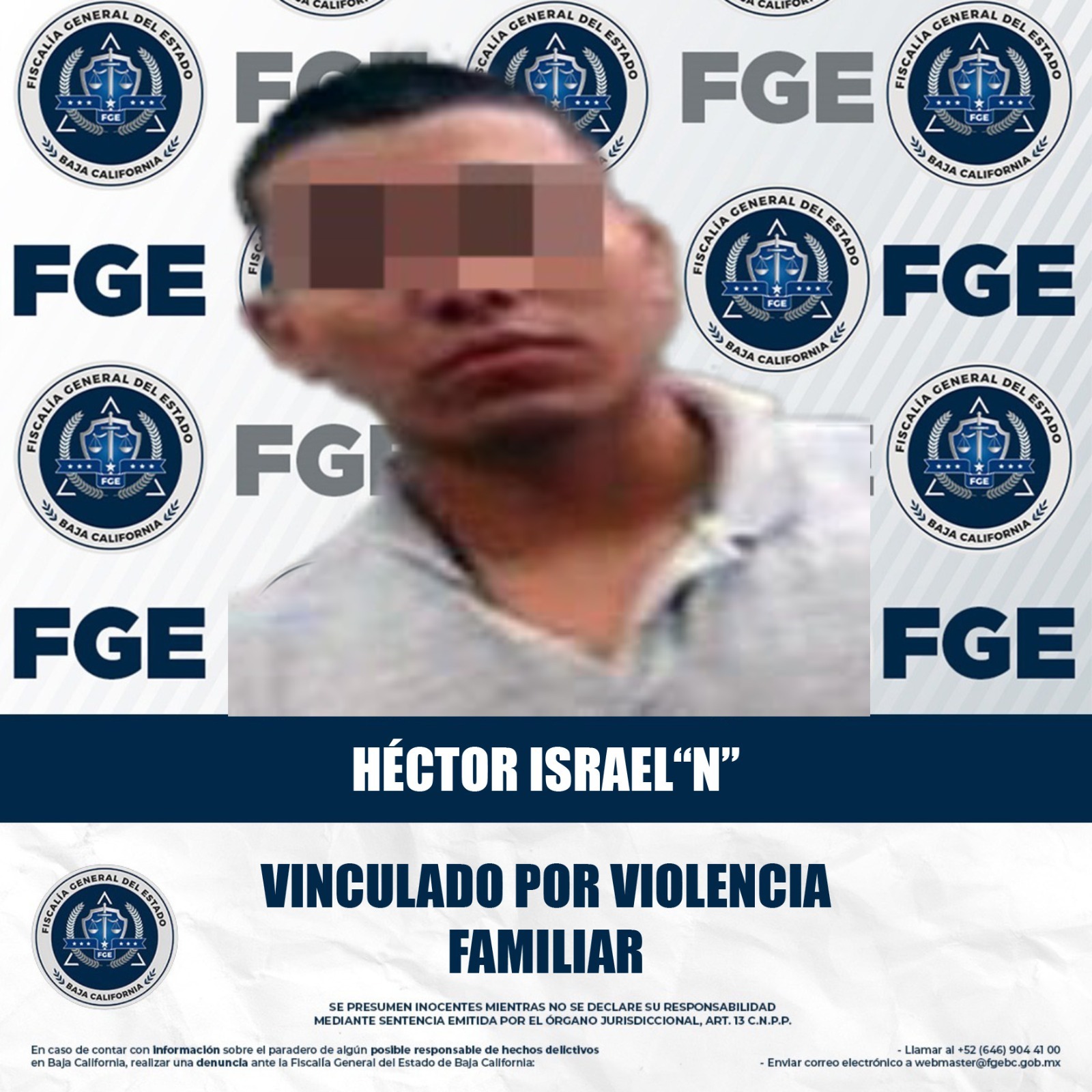 MEXICALI, BAJA CALIFORNIA. - La Fiscalía Regional de Mexicali, a través de la Unidad de Investigación de Delitos con Detenidos Poniente, obtuvo la vinculación a proceso de Héctor Israel “N”, esto por su presunta participación en el delito de violencia familiar.