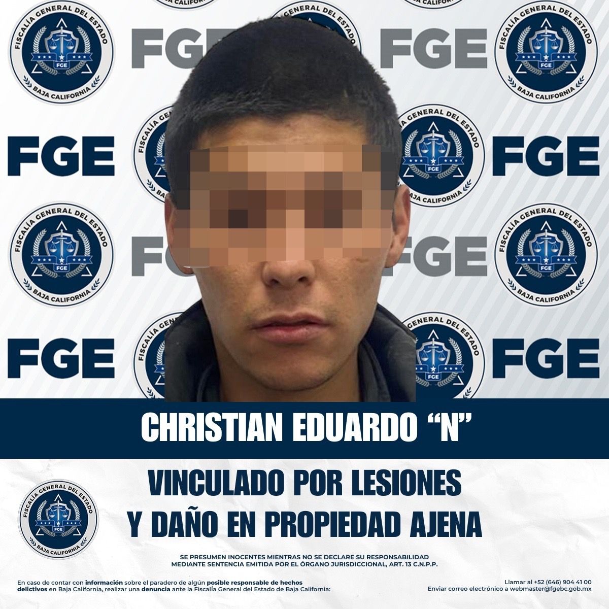 TIJUANA, BAJA CALIFORNIA. - La Fiscalía General del Estado, a través de la Fiscalía Regional de Tijuana, informa que se logró la vinculación a proceso de Christian Eduardo “N”, presunto responsable de los delitos de lesiones y daño en propiedad ajena doloso. Tras la presentación de pruebas por parte de la Unidad de Investigación con Detenido, el Juez de Control determinó imponer la medida cautelar de prisión preventiva justificada.