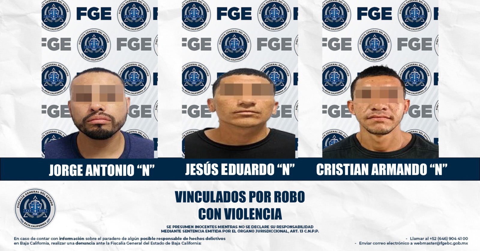 MEXICALI, BAJA CALIFORNIA. - Tres hombres presuntamente involucrados en robos con violencia contra establecimientos comerciales fueron vinculados a proceso, con base a los elementos de prueba presentados por la Fiscalía Regional de Mexicali, a través de la Unidad de Investigación de Robo Poniente.