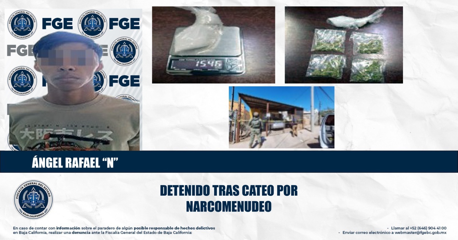 Durante el operativo se logró la detención de Ángel Rafael “N”, así como el decomiso de diversos narcóticos, entre los que destacan una bolsa de plástico transparente cerrada con nudo hermético, la cual contenía en su interior una sustancia granulada al tacto con las características de la droga conocida como metanfetamina.