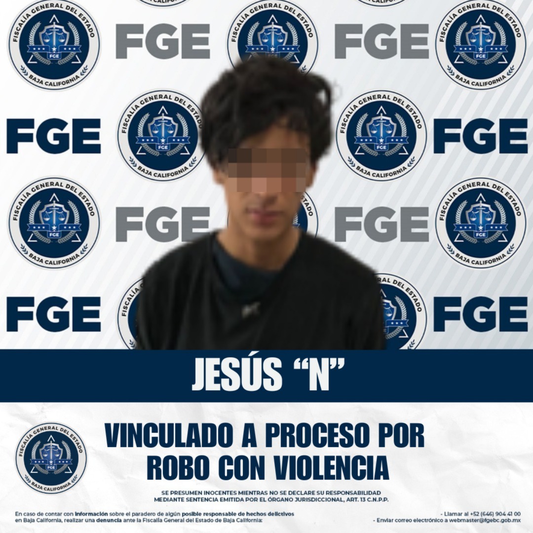 ENSENADA, BAJA CALIFORNIA. - La Fiscalía Regional de Ensenada obtuvo la vinculación a proceso de Jesús “N” por su presunta participación en el delito de robo con violencia, luego de presentar datos de prueba suficientes ante el Juez de Control. En la misma audiencia, la autoridad judicial impuso la medida cautelar de prisión preventiva oficiosa.