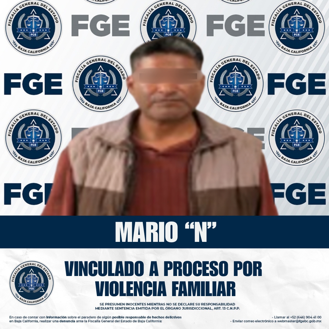 ENSENADA, BAJA CALIFORNIA. - La Fiscalía Regional de Ensenada, a través de la Unidad de Investigación con Detenido, obtuvo la vinculación a proceso de Mario “N” por el delito de violencia familiar.