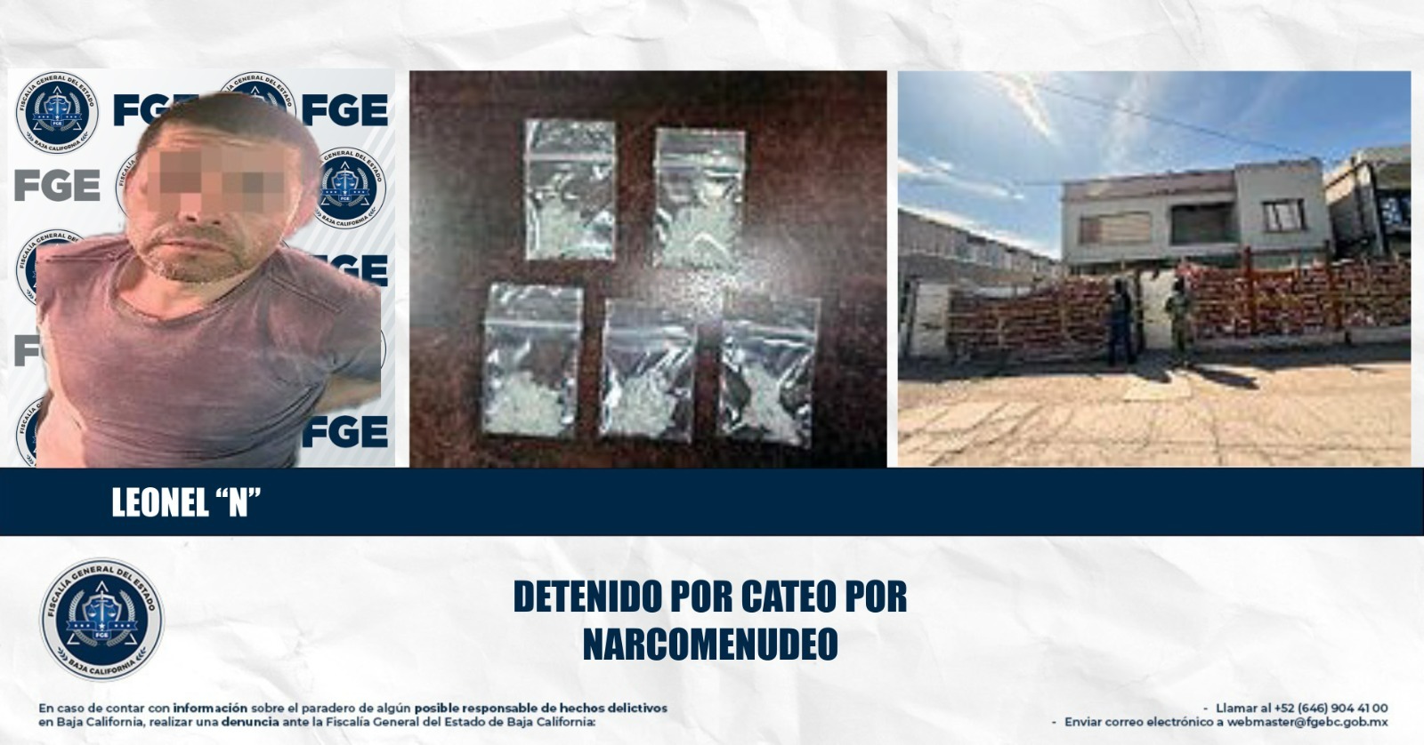 MEXICALI, BAJA CALIFORNIA. - Como resultado de las acciones estratégicas para combatir la venta de sustancias ilícitas en la región, la Fiscalía General del Estado (FGE), a través de la Fiscalía Especializada en Narcomenudeo, cumplimentó una orden de cateo que derivó en la detención de una persona y el decomiso de narcóticos.