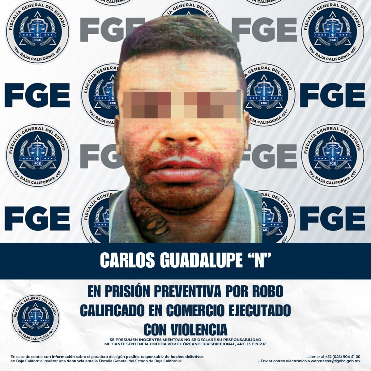 TIJUANA, BAJA CALIFORNIA. - La Unidad de Investigación Especializada en Robos La Mesa, adscrita a la Fiscalía Regional de Tijuana, obtuvo la vinculación a proceso y la medida de prisión preventiva en contra de Carlos Guadalupe “N”, por su presunta responsabilidad en el delito de robo calificado cometido en establecimiento comercial abierto al público, ejecutado con violencia.