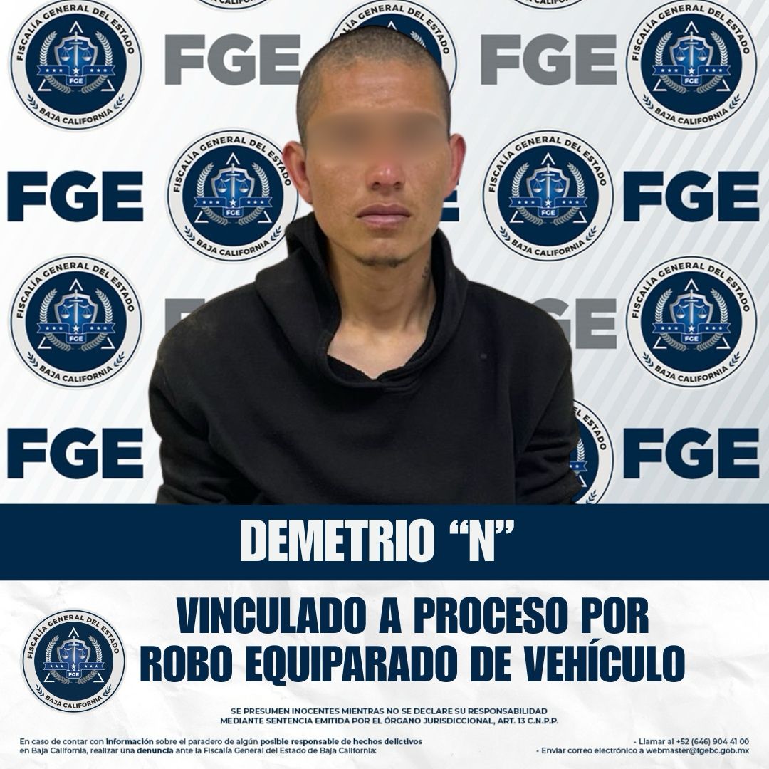 SAN QUINTÍN, BAJA CALIFORNIA. - La Fiscalía Regional de San Quintín, en coordinación con la Unidad de Investigación de San Quintín, logró la vinculación a proceso de Demetrio “N” por el delito de robo equiparado de vehículo, como resultado de la investigación realizada.