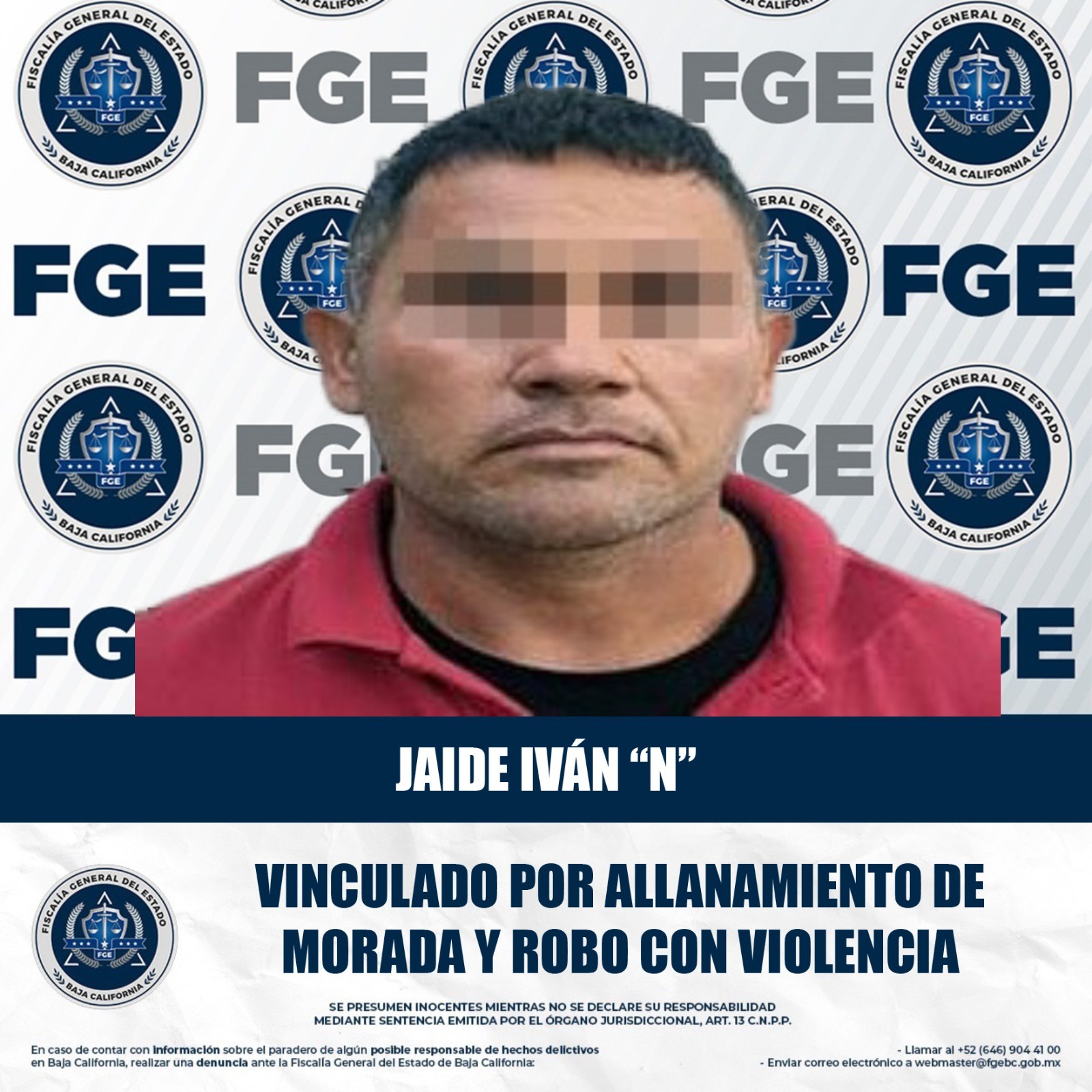 MEXICALI, BAJA CALIFORNIA - La Fiscalía Regional de Mexicali, a través de la Unidad de Investigación de Delitos de Robo de Vehículo, obtuvo la vinculación a proceso de Jaide Iván “N”, esto por su presunta participación en el delito de allanamiento de morada y robo con violencia.