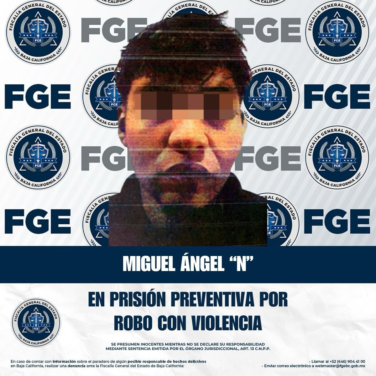 TIJUANA, BAJA CALIFORNIA. - La Fiscalía Regional de Tijuana logró la reapertura del proceso penal e impuso la medida cautelar de prisión preventiva en contra de Miguel Ángel “N”, por su presunta responsabilidad en el delito de robo con violencia.