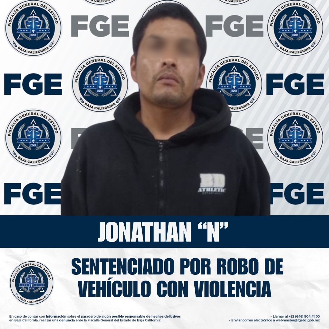 SAN QUINTÍN, BAJA CALIFORNIA. - La Fiscalía Regional de San Quintín, en coordinación con la Unidad de Investigación de San Quintín, obtuvo sentencia condenatoria en contra de Jonathan “N” por los delitos de robo de vehículo con violencia y robo equiparado de vehículo de motor, derivado de la investigación que lo relaciona con dos hechos distintos.